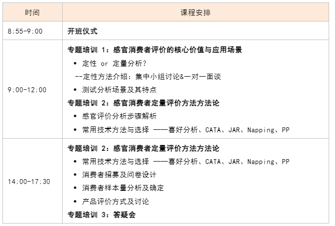 企業(yè)學(xué)習(xí)注重實際應(yīng)用與創(chuàng)新成長,將消費(fèi)者課程打造成為企業(yè)需要的內(nèi)容是我們始終不變的目標(biāo)。感官消費(fèi)者課程融合消費(fèi)者評價到市場應(yīng)用的定性法和定量法,分為基礎(chǔ)班&進(jìn)階班兩部分,致力于全方位解析感官消費(fèi)者全方位內(nèi)容,幫助企業(yè)落地應(yīng)用,讓大家共同進(jìn)步!