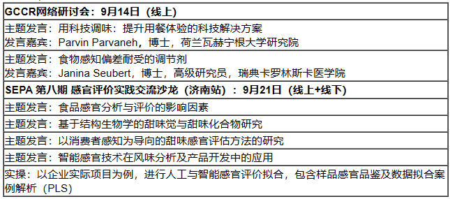 9月14日,GCCR網(wǎng)絡(luò)研討會(huì)邀請(qǐng)到來自瑞典卡羅林斯卡醫(yī)學(xué)院和荷蘭瓦赫寧根大學(xué)的年輕學(xué)者做線上學(xué)術(shù)報(bào)告。9月21日,SEPA 第八期感官評(píng)價(jià)實(shí)踐交流沙龍?jiān)谥袊?guó)·山東·濟(jì)南線下邀請(qǐng)食品行業(yè)感官專家進(jìn)行相關(guān)經(jīng)驗(yàn)分享交流,同步線上直播。