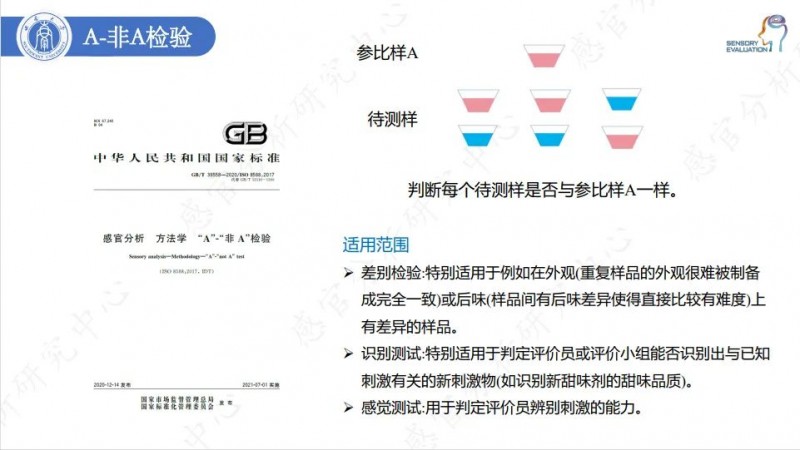 重點:差別檢驗常用方法——三點檢驗法、“A”-非“A”檢驗法、成對比較法的適用性、實驗設計注意點、應用案例及三種差別檢驗的樣品實操練習。