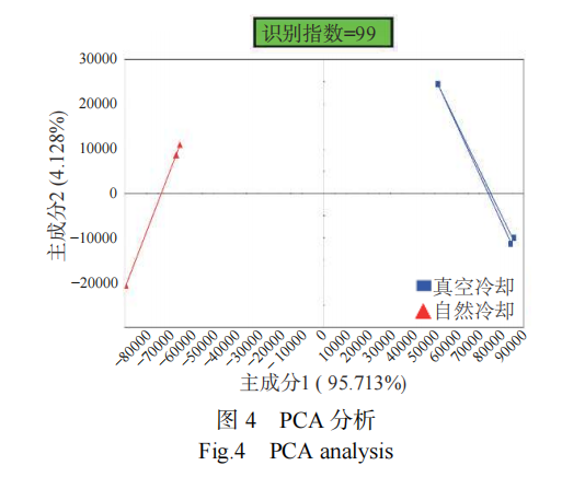 將本實驗電子鼻數據做主成分分析,如圖 4 所示。第一主成分的方差貢獻率為 95.713%,第二主成分的方差貢獻率為4.128%,兩個主成分的貢獻率之和達到 99.841%,能夠很好地反映樣品實際情況。同時,識別指數(discrimination index, DI)是用來表征樣品之間區(qū)分度大小的一種判斷方法,有效范圍在 80~100,且值越高說明得到的數據效果越好。在本實驗 PCA 分析中,識別指數達到 99,說明自然冷卻的醬牛肉和真空冷卻的醬牛肉可以很好地區(qū)分出來,且效果較佳。在主成分分析中,樣品之間相對距離越遠,表明樣品間氣味差異越大,從圖中可以看出兩種冷卻方式處理的醬牛肉之間距離較遠,在第一主成分方向顯示出明顯的分離,表明兩種醬牛肉氣味差異較為顯著,可以被很好地區(qū)分。