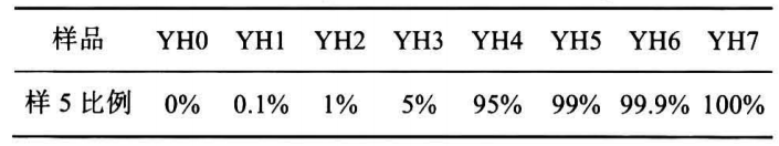 由圖6可知,2個(gè)主成分的貢獻(xiàn)率分別為59.444%、31.689%,總貢獻(xiàn)率可達(dá)9l_3l%,其中GH0為純的4號(hào)樣,GH4為純的3號(hào)樣,二者數(shù)據(jù)點(diǎn)分布區(qū)分明顯,并且由樣GHI與二者數(shù)據(jù)分布較遠(yuǎn)可以得出,檢測(cè)限可低至0.1%,仍可區(qū)分。由圖7可知,DFA方法的2個(gè)主成分貢獻(xiàn)率為63.226%、35.152%,總貢獻(xiàn)率可達(dá)98.38%,且純的3號(hào)樣與純的4號(hào)樣區(qū)分明顯,各摻雜比例的數(shù)據(jù)點(diǎn)分布也無重復(fù)區(qū)域。比較圖6,圖7可以看出DFA方法明顯優(yōu)于PCA方法。且2種方法都可以明顯地區(qū)分這兩者的摻雜。