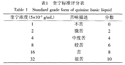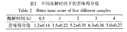 本文首先對(duì)大豆肽的苦味特性進(jìn)行人工感官評(píng)價(jià),然后冉研究電子舌儀器進(jìn)行感官分析。本實(shí)驗(yàn)從對(duì)苦味敏感的專業(yè)人員中選取10位感官評(píng)價(jià)員(5男5女)進(jìn)行感官評(píng)價(jià),每次品嘗之后,需要用清水漱口,再進(jìn)行下一次品嘗。最后,將與其口味接近的奎寧標(biāo)準(zhǔn)液濃度對(duì)應(yīng)的分值記為此溶液的得分。之后取10位評(píng)價(jià)人員的平均分為苦味評(píng)定分?jǐn)?shù)。以奎寧的作為評(píng)分標(biāo)準(zhǔn),評(píng)分標(biāo)準(zhǔn)見(jiàn)表1。表2為風(fēng)味蛋白酶不同水解時(shí)問(wèn)下的苦味得分值。