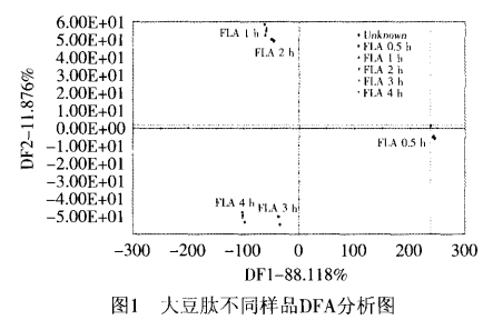 采用法國(guó)AlphaMOS電子舌對(duì)制取的五種不同酶解時(shí)間條件下的樣品進(jìn)行苦味特性研究。分別采用DFA模式識(shí)別方法和PLS預(yù)測(cè)模型對(duì)采集的數(shù)據(jù)進(jìn)行定性和定量分析,研究表明:采用DFA分析法能夠?qū)ξ宸N不同的大豆肽樣品的呈味特性和味覺(jué)相似程度進(jìn)行定性評(píng)價(jià),PLS模型能對(duì)未知樣品進(jìn)行呈味預(yù)測(cè);大豆肽的苦味預(yù)測(cè)結(jié)果與實(shí)際感官評(píng)價(jià)吻合。研究結(jié)果為后續(xù)大豆肽產(chǎn)品的呈味特性研究提供一種新的方法途徑。