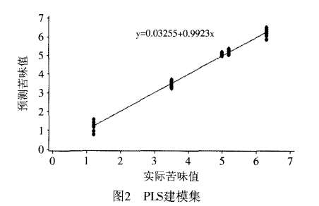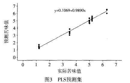 用PLS建立大豆肽溶液電子舌苦味預(yù)測(cè)模型,并對(duì)電子舌傳感器響應(yīng)值與人工感官評(píng)價(jià)得分值問(wèn)的相關(guān)性進(jìn)行研究。以七根傳感器的響應(yīng)信號(hào)值為白變量,以感官得分值為因變量構(gòu)建偏最小二乘模型。建模集為60個(gè)樣本,驗(yàn)證集為30個(gè)樣本。結(jié)果如圖2、圖3所示,分別表示建模集、預(yù)測(cè)集的實(shí)際苦味值與預(yù)測(cè)值的相關(guān)圖。