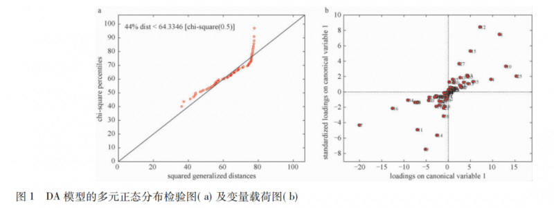 DA 辨識模型及交互驗證 80 個樣本的測試結(jié)果多元正態(tài)分布檢驗圖見圖 1,橫坐標(biāo)為平方廣義距離,縱坐標(biāo)為卡方上側(cè)分位數(shù)對應(yīng)的檢驗值。樣本分布圖形略呈線性; 約 44%的距離小于卡方分布分位數(shù)表 0. 5 對應(yīng)的檢驗值,說明檢驗值在卡方分布分位數(shù)表 0. 5 對應(yīng)的檢驗值的下側(cè)分布略微集中。