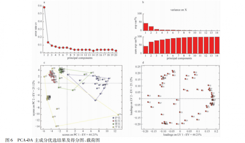 變量選擇14 個,識 別 模 式 選 擇 線 性; 模 型 最 優(yōu) 正 判 率 為97. 3%。前 3 個主成分之和達(dá) 75%以上,可解釋原變量大部分信息,見圖 6。