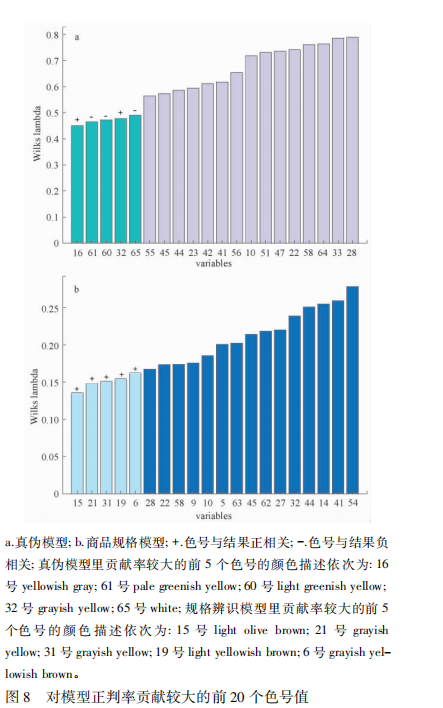 在只考慮變量信息本身、不考慮分類結(jié)果模型的情況下,65 個變量所攜帶變異信息( Wilkslamda) 的柱狀圖見圖 8,Wilkslamda 越小則表示變量攜帶變異信息越多。真?zhèn)伪孀R中 65 個變量在潛變量上的載荷圖,見圖 2,50 號變量在原點附近,說明該特征屬性的波動對于樣本之間的區(qū)別貢獻(xiàn)不大,其余64 個變量整體較為分散,說明這 64 個變量均攜帶有顯著的變異信息。商品規(guī)格辨識中 65 個變量在潛變量上的載荷圖見圖 6。