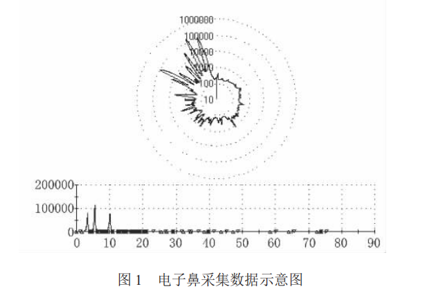 在獲得人工感官評分后,按醇香、陳香、焦香和異香分別對采集到的數(shù)據(jù)進行定量, 同時通過化學計量學方法使用多變量統(tǒng)計軟件進行分析并建立定量模型。采集到的數(shù)據(jù)形式如同氣相色譜圖,見圖 1,下半部分是氣相色譜圖,而上半部分是對應的雷達圖。將圖中每一個色譜峰都看作一個傳感器, 而影響不同香氣的指標對應著不同的傳感器,稱之為特征傳感器。同時,對各項指標進行的定量評分研究也都立足于特征傳感器的選擇上。