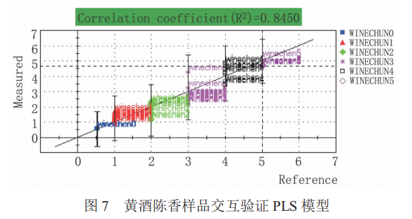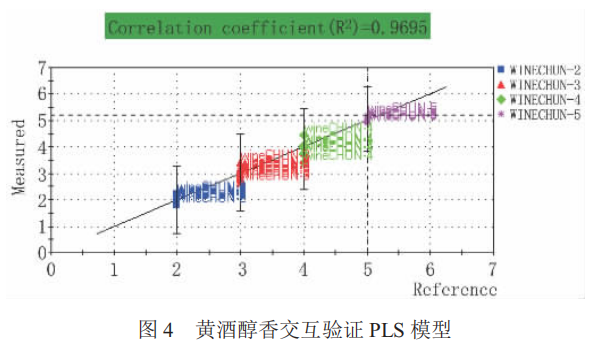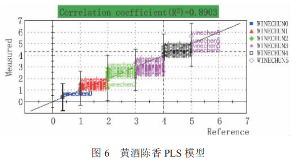 實驗結果顯示,從醇香、陳香、焦香這 3 個因素來對黃酒的香氣成分分別建立定量模型,進行交互驗證后,準確率分別達到 97.3 %、97.3 %和 94.6 %。本項目研究是基于電子鼻技術替代人體嗅覺系統(tǒng)對黃酒的香氣進行系統(tǒng)化評價的定量模型,其預測結果重復性好、準確度高,可以在生產(chǎn)、 鑒評過程中替代品酒員而應用于黃酒的香氣感官品評,有效減少人為誤差。