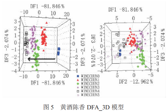 由圖 5 看出, 陳香分值沿圖 5 左圖中所示箭頭方向遞增,其中 DF1 占 81.8 % 、DF3 占 2.1 %。從圖 5 中左圖可以看到,在 DF1 方向上,陳香分值為 4 分和 5 分的樣品差異不明顯,其余分值差異較明顯,這說明在陳香分值為 0~4 分的酒樣中,DF1 占最主要因素;而在圖 5 中右圖所示陳香分值為 4 分和 5 分的酒樣差異較明顯, 這說明 DF2 和 DF3 在陳香分值為 4~5 分的酒樣區(qū)分中占主要因素,圖 5 中 DF2 占 13.0 %。