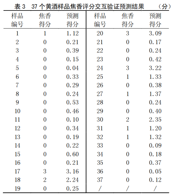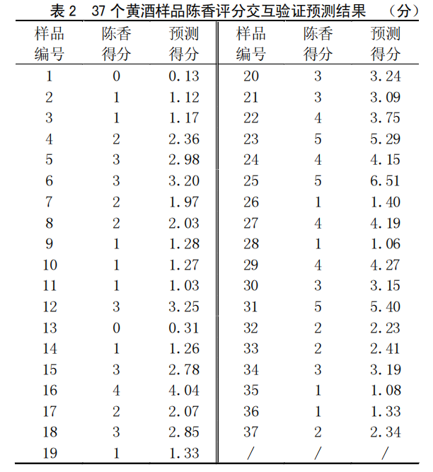 從表 1 可以看出, 所有樣品的醇香得分經(jīng)交互驗證顯示,驗證準確率為 97.3 %。其中 25 號樣品醇香分值為5 分的酒樣,其預測得分略高,查得此樣品為 40 年陳釀,而 31 號樣品醇香分值為 5 分,預測結果相對接近,查得此樣品為 20 年陳釀。這可能是由于二者年份上的差異加上評分機制最高為 5 分,而導致預測結果略有偏離。在實際感官品評時,不影響其得到最高分值。