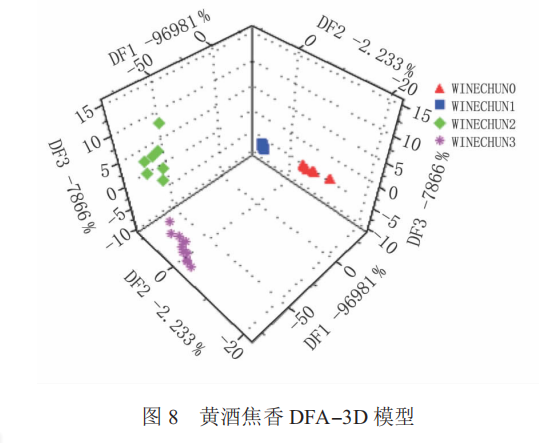 從圖 8 中可以看出,4 個焦香分值的酒樣分布具有顯著的區(qū)域性。在區(qū)別 0 分與 1 分的酒樣時 DF2 占主要因素;區(qū)別 1 分與 2 分的酒樣時 DF1 占主要因素;區(qū)別 2 分與 3 分的酒樣時 DF3 占主要因素。圖中 DF1 占97.0 %,DF2 占 2.2 %,DF3 占 0.8 %。