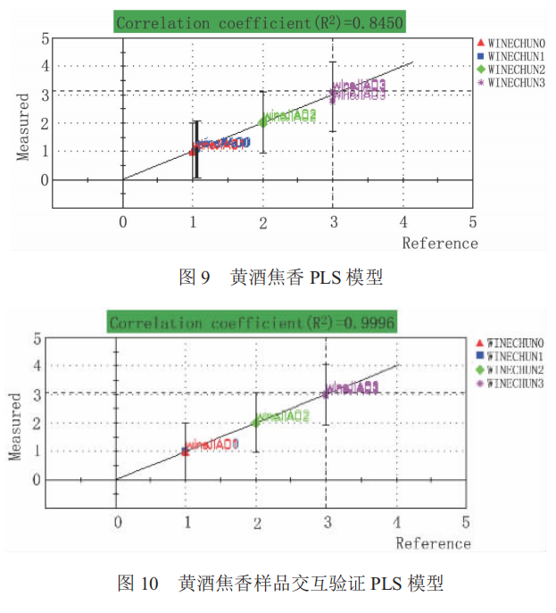 建立焦香 PLS 定量模型,2 個定量模型的相關系數(shù)分別為 0.9985 和 0.9998,線性關系良好,見圖 9 和圖 10。進行交互驗證后的數(shù)據(jù)見表 3。