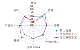 傳統(tǒng)工藝熬制和現(xiàn)代工藝熬制的“佛跳墻”滋味上的差異可以通過電子舌區(qū)分,二者之間的差異主要表現(xiàn)在苦味和澀味上。