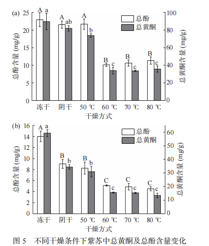 2.冷凍干燥、自然陰干及50℃干燥三種條件下總酚含量無顯著性差異(P>0.05),總黃酮含量雖有差異,但不甚明顯。當(dāng)溫度提高至60℃后總酚及總黃酮含量明顯下降。對(duì)于紫蘇莖,冷凍干燥品的總酚及總黃酮含量均最高;其次為自然陰干品及50℃干燥品,且二者無顯著性差異(P>0.05),當(dāng)溫度提高至60℃后,總酚及總黃酮含量明顯下降。