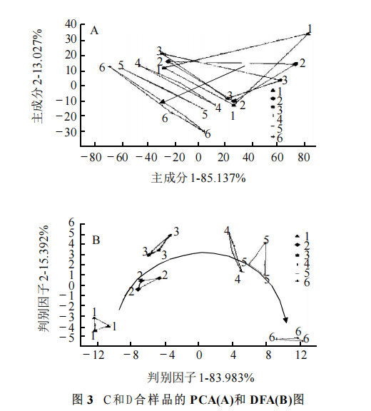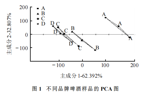 樣品準(zhǔn)備 樣品 C 和 D 進(jìn)行混合,混合比例 C:D(V/V)為 10:90 、30:70 、50:50 、70:30 、90:10 、100:0,編號(hào)分別為1、2、3、4、5、6。 傳感器信號(hào)分析 檢測(cè)每一個(gè)樣品時(shí)傳感器共采集120s 。在進(jìn)行數(shù)據(jù)分析與處理時(shí),采用第120秒所得的穩(wěn)定數(shù)據(jù)作為輸出值進(jìn)行分析。 數(shù)據(jù)分析方法 根據(jù)傳感器采集的原始數(shù)據(jù),分別采用主成分分析 (PCA) 、判別因子分析 (DFA)和偏最小二乘回歸分析(PLS)分析。 結(jié)果與分析 不同品牌啤酒對(duì)比 主成分分析(PCA) PCA 是將所提取的傳感器多指標(biāo)的信息進(jìn)行數(shù)據(jù)轉(zhuǎn)換和降維,并對(duì)降維后的特征向量進(jìn)行線性分類,最后在PCA圖上顯示主要的兩維圖。橫、縱坐標(biāo)分別表示在 PCA 轉(zhuǎn)換中得到的第一主成分(PC1)和第二主成分(PC2)的貢獻(xiàn)率(或權(quán)重) ,貢獻(xiàn)率越大,說明主成分可以較好地反映原來多指標(biāo)的信息 。