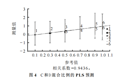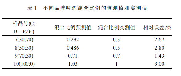 分別以C和D不同混合比例的4個(gè)樣品進(jìn)行模型的驗(yàn)證,結(jié)果見表1 。PLS 模型對(duì)混合比例為30:70 、50:50 、70:30 、100:0 的4個(gè)樣品預(yù)測(cè)效果較好,相對(duì)誤差在1.43%~3.00 %之間。說明 PLS 模型能夠很好地預(yù)測(cè)不同品牌啤酒的混合比例。