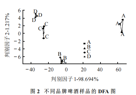 圖1為不同品牌啤酒樣品的主成分分析圖, 第一主成分和第二主成分的總貢獻(xiàn)率達(dá)到了95 .2% ,足以收集特征性信息。不同品牌的啤酒分別聚類在 PCA 圖中的不同區(qū)域,相互之間能夠較好地區(qū)分。 判別因子分析(DFA) DFA 是一種通過重新組合傳感器數(shù)據(jù)來優(yōu)化區(qū)分性的分類技術(shù),它的目的是使各個(gè)組間的重心距離最大同時(shí)保證組內(nèi)差異最小,在充分保存現(xiàn)有信息的前提下,使同類數(shù)據(jù)間的差異性盡量縮小,不同類數(shù)據(jù)間的差異盡量擴(kuò)大 。