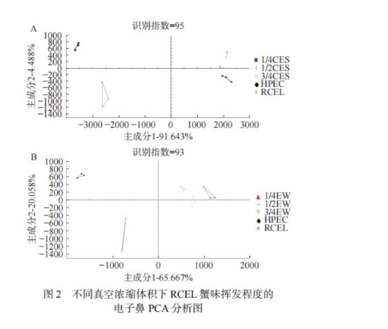 當(dāng)真空濃縮體積分別濃縮至原體積的3/4、1/2、1/4時(shí),停止旋轉(zhuǎn)蒸發(fā)過(guò)程,得到CES,同時(shí)收集EW,分別記為3/4CES、1/2CES、1/4CES;3/4EW、1/2EW、1/4EW。最后將3/4CES、1/2CES、1/4CES;3/4EW、1/2EW、1/4EW以及RCEL進(jìn)行電子鼻PCA分析。