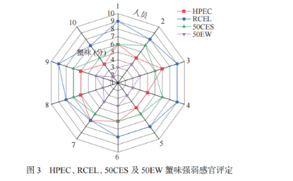 香氣感官評(píng)定 隨機(jī)選擇10名經(jīng)過(guò)感官評(píng)定培訓(xùn)的人員,對(duì)制備的HPEC、RCEL、50CES和50EW蟹味強(qiáng)弱進(jìn)行評(píng)定,蟹味濃,取7~10分;蟹味稍濃,取4~7分;蟹味較淡,取0~4分。