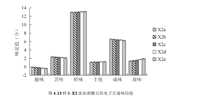 完成鮮味的調(diào)配后,由圖4-11可知樣本X2在甜味上仍與W有一定差距,因此X在添加了MSG的基礎(chǔ)上需要進一步提升甜味。在X2中分別添加0.1, 0.2, 0.3, 0.4,0.5 g/100ml的蔗糖,依次命名為X2a, X2b, X2c, X2d, X2e,測試得滋味響應(yīng)如圖4-13所示。由圖可見,隨著糖濃度的升高,樣品的酸味、苦味和咸味有不同程度的下降,而甜味逐漸升高。