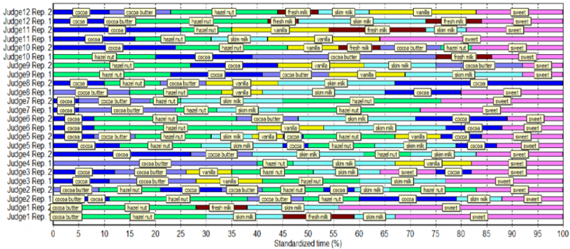 TDS品評(píng)法 旨在收集受試者在品嘗產(chǎn)品期間感知到的主要感覺(jué)的序列。例如,在品嘗一塊巧克力時(shí),從攝入到吞咽,品評(píng)人員可以依次感知可可、可可脂、榛子可可和甜味等屬性作為主導(dǎo)感覺(jué)。