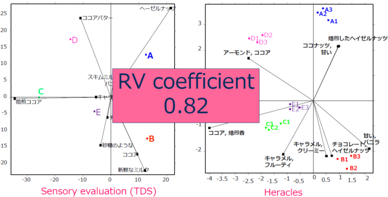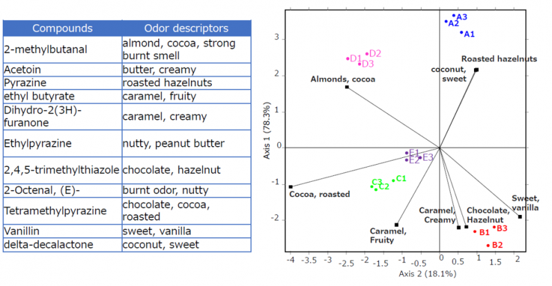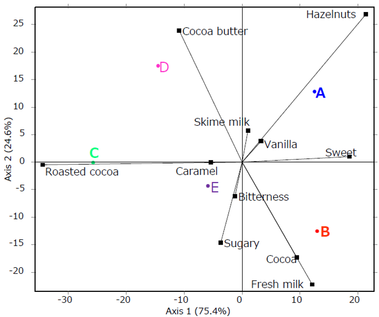 通過(guò)TDS持續(xù)時(shí)間生成的主成分分析圖:A,B,C,D,E 這幾個(gè)樣品都有不同的感官特征,比如A產(chǎn)品的榛子味濃一些,C產(chǎn)品的烤可可味更濃一些。