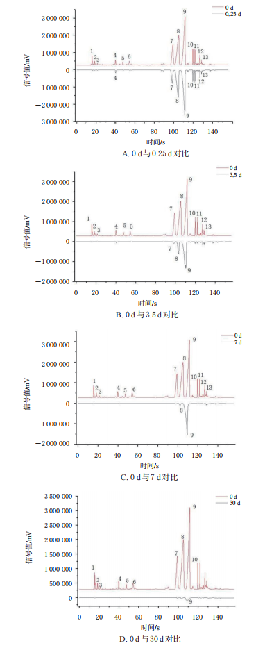 不同放置時間下兒童型香囊的氣味信息鏡像對比圖見圖2。由圖2可知,兒童型香囊放置0.25d后,有5種氣味成分消失。與放置0d相比,放置0.25d后,7號峰強度下降了45.8%,8號峰強度下降了21.8%,9號峰強度下降了14.4%;放置3.5d后,7號峰強度下降了90.8%,8號峰強度下降了70.1%,9號峰強度下降了50.8%;放置7d后,大部分氣味成分基本消失,9號峰強度下降了56.8%;放置30d后,9號峰基本消失。
