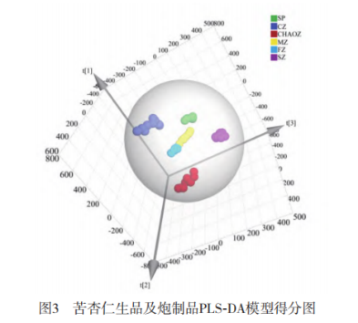 根據(jù)PCA模型分類結(jié)果,按照不同炮制方法將樣品分為6類,建立PLS-DA模型。在PLS-DA模型中,前7個(gè)主成分R2X(cum)為99.4%,R2Y(cum)為97.9%,Q2(cum)為97.1%,說明所建立的模型性能良好。如圖3所示,PLS-DA模型得分圖顯示生品和5種炮制品各自聚為一類,表明不同炮制方法可顯著影響苦杏仁的揮發(fā)性成分。