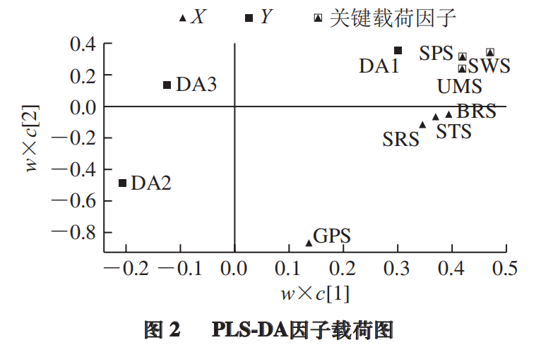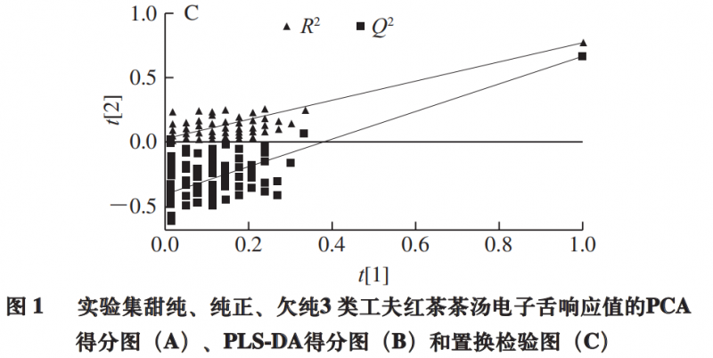 為探索電子舌檢測(cè)能否用于工夫紅茶茶湯滋味的判別,以電子舌7 個(gè)傳感器響應(yīng)值為X變量,以茶湯滋味分組(甜純、純正、欠純)為Y變量做PLS-DA。PLS-DA是一種有監(jiān)督的模式識(shí)別方法,相對(duì)于PCA所得的投影通常可獲得更好的分類效果。如圖1B所示,3 類(甜純、純正、純)茶湯的聚類結(jié)果類似于PCA的結(jié)果(R2x =1,R2Y =0.61,Q2 =0.512)。Q2 大于0.5,表明模型具有較好的預(yù)測(cè)能力。過(guò)擬合是PLS-DA模型的一個(gè)常見(jiàn)問(wèn)題。為進(jìn)一步驗(yàn)證PLS-DA模型的可靠性,對(duì)該模型進(jìn)行置換檢驗(yàn)驗(yàn)證(圖1C)。將模型建立時(shí)定義的Y矩陣的變量隨機(jī)排列100 次,得到R2和Q2 截距分別為(0.0,0.029)和(0.0,-0.399),表明PLS-DA模型穩(wěn)定可靠,未存在過(guò)擬合,可用于不同滋味的判別。