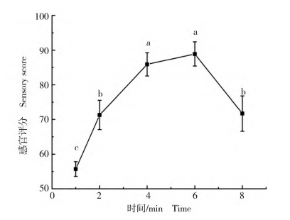 以色澤、氣味、滋味、口感為指標(biāo)對不同蒸制時(shí)間下的脊尾白蝦進(jìn)行感官評價(jià)。在蒸制的前4min,脊尾白蝦的綜合評分呈直線上升,4~6min變化不顯著(P>0.05);當(dāng)蒸制時(shí)間為6min時(shí),綜合感官評分最高;在蒸制8min時(shí)蝦體色澤暗淡,蝦體有所損壞,綜合評分下降(圖2)。