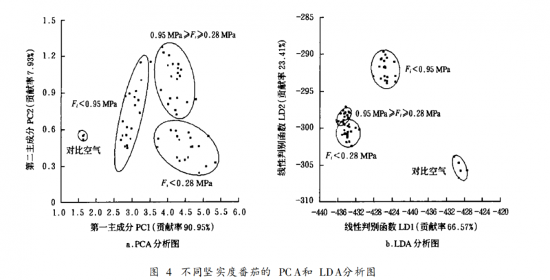 按堅(jiān)實(shí)度指標(biāo)對番茄成熟度進(jìn)行重新劃分,將番茄按堅(jiān)實(shí)度分為3個(gè)等級: Fi > 0. 95 M Pa的為半熟期, 0. 95 M Pa≥ Fi≥ 0. 28 M Pa的為成熟期, Fi < 0. 28M Pa的為完熟期。圖4顯示了電子鼻的分析結(jié)果, PCA 分析的總的貢獻(xiàn)率為98. 88% , LDA分析的總的貢獻(xiàn)率為89. 98%。從中可以看出,電子鼻可以區(qū)別番茄的堅(jiān)實(shí)度差異,采用PCA方法分析時(shí),電子鼻可以100% 地區(qū)分不同成熟度的番茄。