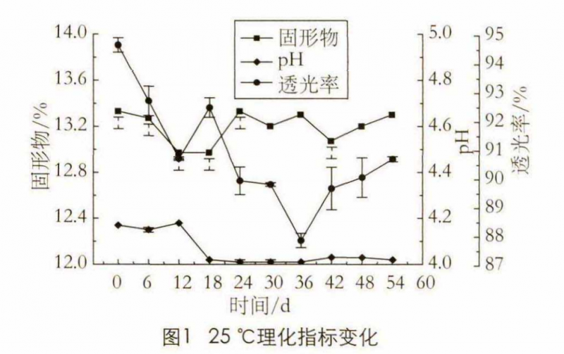 由圖1可知:25 °C下隨著儲藏時間的延長,可溶性固形物含量維持在12.87%? 13.23%,整體趨勢變化幅度不大。pH在第 18天降低為3.56,過低的pH會影響格瓦斯的風味與口感。隨著儲藏時間不斷延長,透光率從初始94.68%出現(xiàn)明顯下降,第 18天為9 2 . 5 2 % ,第24天降低為90.07%。根據(jù)實驗可知,當透光率降到% %以下時,飲料色澤會變差、出現(xiàn)細小渾濁,因此設定透光率低于90 % 的儲藏時間為貨架期終點。目卩25 °C時青稞格瓦斯貨架期為24 d。