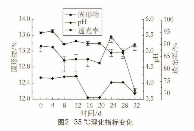 由圖2可知:在35 °C下 ,可溶性固形物含量在 13.47%? 12.80 % ,變化不明顯。隨著時間的延長pH呈下降趨勢,在第16天時降低明顯,降低至3.55。當儲藏至 12、16 d, 透光率分別降低至91.33 %、90.73 %。綜合固形物、pH、透光率可知,青稞格瓦斯儲藏于35 °C下的貨架期為16 d。