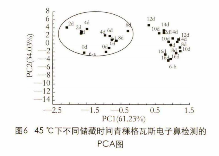 由圖6可知:在45 °C時 ,第一、二主成分的貢獻度分別為 61.32 % 、34.03 % , 總貢獻率達95.35 % ,說明主成分可以將原始髙維矩陣數(shù)據(jù)的信息較好地反映出來。樣品在6 d前各點分布集中,風味無明顯變化;6 d后各點在PCA圖譜上的分布與區(qū)域6-a距離較遠,風味發(fā)生顯著變化。從風味變化的角度分析,青稞格瓦斯儲藏在45 °C下貨架期為6 d。