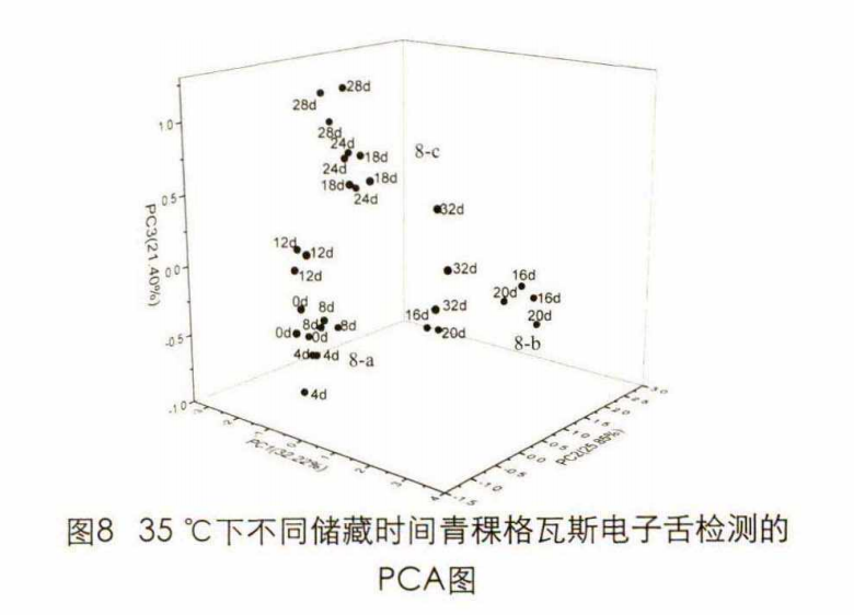 由圖8可知:當儲藏溫度為35 °C時 ,第一、二、三主成分的貢獻度分別為32.22%、25.85%、21.40%,總貢獻率達79.47%,基本上解釋了樣品的大部分信息。在三維圖譜上可以看出,隨著儲藏時間的延長,樣品延PC1、PC2構成的底面從左至右開始分布,延PC3軸先向下后向上開始分布。在儲藏時間32 d內,隨著滋味的變化樣品在PCA三維圖譜上形成了3個分布界限較為明顯的區(qū)域 ,8-a、8-b、8-c , 儲藏時間分界線分別是 12 d、16?20 d、 18 ? 24 d。