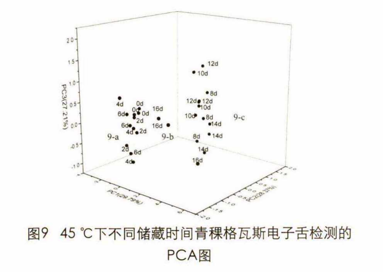 由圖9可知:在溫度為 45°C時 ,第 一 、二 、三 主 成 分 的 貢獻度分別為 29.79 % 、28.37 % 、27.21 % ,總貢獻率達85.37%, PCA三維圖譜基本上反映樣品的大部分信息。由圖9可知,樣品基本上延PC3軸向上分布,形成9-a、9-b、9-c 3個分界明顯的區(qū)域。6 d前各點分布緊密,形成區(qū)域9-a;6 d后隨著儲藏時間的延長樣品在PCA三維圖譜上的分布較區(qū)域9-a較遠,且各自分布松散,可能是由于儲藏時間較長,導致滋味呈無規(guī)律變化。從滋味角度可以反映出儲藏于45 °C ,青稞格瓦斯的貨架期為6 d。