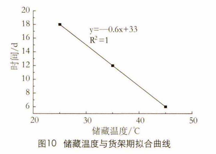 Q10值為溫度相差10 °C時食品的貨架期之比,該值用來確定溫度對反應的敏感程度,大多數(shù)據(jù)為2。由表1可知,3種溫度下青棵格瓦斯的貨架期數(shù)據(jù),計算得Q10為 1.5?2.0,平均值為 1.75。應用Origin軟件對貨架期Y和溫度X的關系進行曲線擬合,發(fā)現(xiàn)Y與X的關系最符合一次函數(shù),擬合方程為Y=-0.6X+33, R2=1。為驗證模型的準確性 ,實驗選取28、38 °C儲藏,所得格瓦斯的貨架期分別為 18、10 d, 模型預測值為16.2、10.2 d,預測值的相對誤差率在-1 0 %?2 % , 誤差較小,說明此模型可快速地對青棵格瓦斯貨架期進項初步預測。