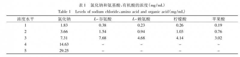 本文選取 L-谷氨酸 ( L-Glu ) 、L-賴氨酸( L-Lys) 、L-檸檬酸(L-Citric)、L-蘋果酸( L-Malic) 為研究對象,以0.03125、0.0625、0.125、0.25、0.50 moL /L( 即 1.83、3.66、7.31、14.63、29.25 mg /mL)的氯化鈉作為反應(yīng)濃度。將不同濃度的谷氨酸、賴氨酸、檸檬酸、蘋果酸 ( 表 1 所示) 分別添加至1.83、3.66、7.31、14.63、29.25 mg /mL 的氯化鈉溶液當(dāng)中,配制成 4 組不同的溶液。
