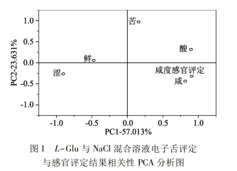 對L-Lys 與 NaCl 混合溶液的感官咸度評(píng)分和電子舌所測得的咸、酸、苦、澀、鮮五組數(shù)據(jù)進(jìn)行主成分分析,如圖 4 所示,PC1 和 PC2 累積方差貢獻(xiàn)率為81.219%,“感官咸度評(píng)分”和電子舌數(shù)據(jù)“咸”在圖上位 置 重 合,而與電子舌其他數(shù) 據(jù)“酸”、“苦”、“澀”、“鮮”距離很遠(yuǎn),說明電子舌對溶液咸度的評(píng)分“咸”與感官咸度評(píng)分相關(guān)性較高。