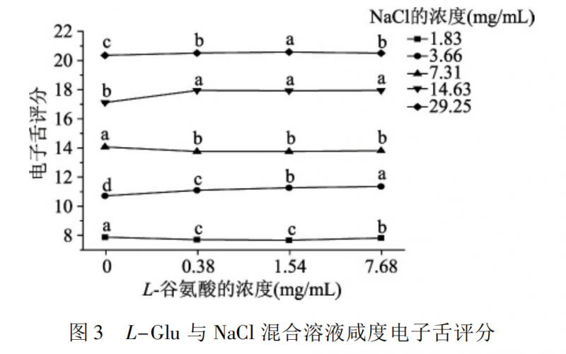 圖 2 是 L-谷氨酸與氯化鈉混合溶液咸度的感官評(píng)定結(jié)果,可以看出在相同的氯化鈉濃度水平下,混合溶液與氯化鈉溶液的咸度差異不顯著( p > 0.05) ;圖 3 是電子舌對溶液咸度的評(píng)定結(jié)果,混合溶液與氯化鈉溶液的咸度有顯著性差異( p < 0.05) ,在 1.83、7.31 mg /mL 氯化鈉水平下,混合溶液的咸度低于氯化鈉溶液的咸度,而在 3.66、14.63、29.25 mg /mL 氯化鈉水平下,混合溶液的咸度高于氯化鈉溶液的咸度。