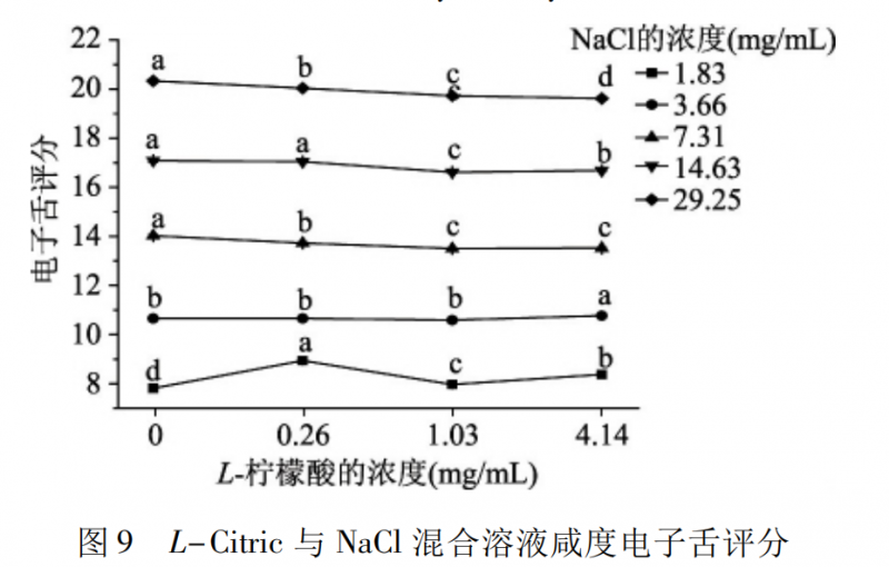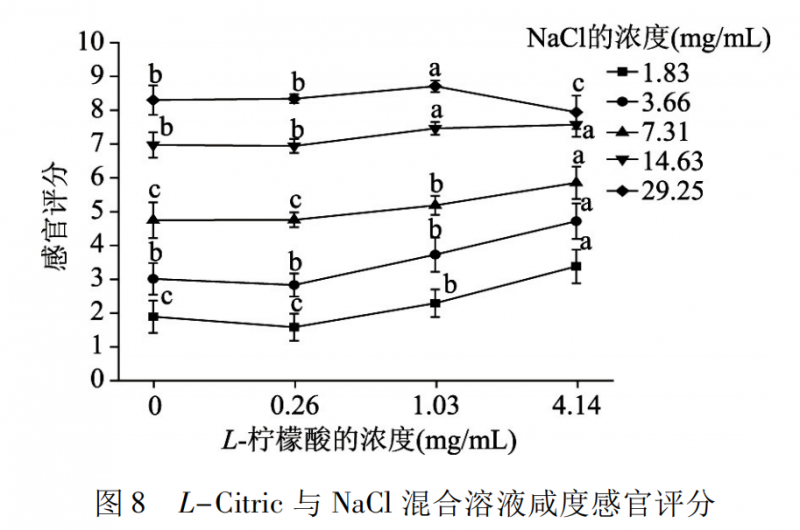 圖8 是 L-Citric 與 NaCl 混合溶液咸度的感官評(píng)定結(jié)果。在相同的氯化鈉濃度水平下,添加 0.26 mg /mL L-檸檬酸的混合溶液與氯化鈉溶液的咸度沒有顯著差異( p > 0.05) ,添加 1.03、4.14 mg /mL L-檸檬酸的混合溶液的咸度則顯著高于氯化鈉溶液的咸度( p <0.05) ; 但是在 29.25 mg /mL 氯化鈉濃度下添加4.14 mg /mL L-檸檬酸時(shí),混合溶液的咸度則受到抑制,不同的味道在口中具有不同的傳導(dǎo)途徑,當(dāng)氯化鈉和檸檬酸的濃度過高時(shí),檸檬酸會(huì)對氯化鈉的味覺傳導(dǎo)途徑產(chǎn)生影響,阻礙了氯化鈉咸度的感知。