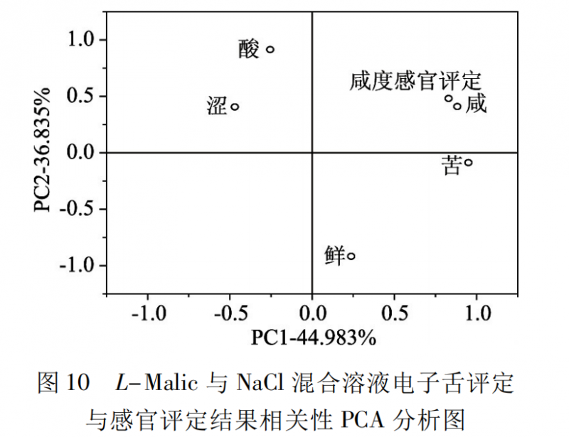 對L-Malic與 NaCl 混合溶液的感官咸度評(píng)分和電子舌所測得的咸、酸、苦、澀、鮮五組數(shù)據(jù)進(jìn)行主成分分析( 如圖 10 所示) 。PC1 和 PC2 累積方差貢獻(xiàn)率為81.818%,“感官咸度評(píng)分”和電子舌數(shù)據(jù)“咸”在圖上位置相近,表明電子舌對溶液咸度的評(píng)分“咸”與感官咸度評(píng)分相關(guān)性較高。