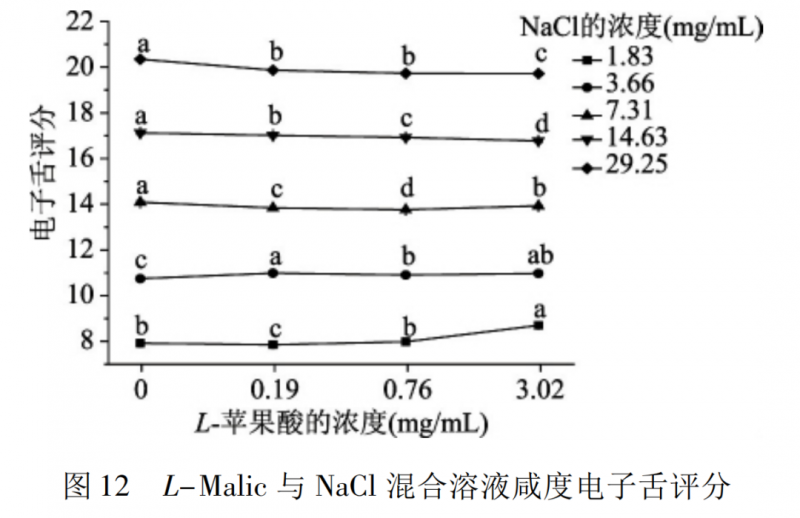 圖 11 是 L-Malic 與 NaCl 混合溶液咸度的感官評(píng)定結(jié)果。在 1.83、3.66 mg /mL 的氯化鈉濃度下,添加 0.76、3.02 mg /mL L-蘋果酸的混合溶液的咸度顯著高于氯化鈉溶液(p < 0.05) ; 在 29.25 mg /mL 氯化鈉濃度下,添加 3.02mg /mL L-蘋果酸的混合溶液的咸度顯著低于氯化鈉溶液(p < 0.05) 。圖 12 是電子舌對溶液咸度的評(píng)定結(jié)果。在 1.83,3.66 mg /mL 的氯化鈉濃度下,混合溶液的咸度顯著高于氯化鈉溶液( p <0.05) ; 而在其他氯化鈉濃度下,混合溶液的咸度顯著低于氯化鈉溶液( p < 0.05) ,其中在 7.31 mg /mL的氯化鈉濃度下,添加 3.02 mg /mL L-蘋果酸的混合溶液的咸度顯著高于其他兩組混合溶液,但仍顯著低于氯化鈉溶液( p < 0.05) 。將 L-蘋果酸與氯化鈉混合溶液咸度的感官評(píng)定結(jié)果和電子舌評(píng)定結(jié)果進(jìn)行相關(guān)性分析,發(fā)現(xiàn)其相 關(guān) 性 系 數(shù) r = 0.984 ( p <0.01) 。