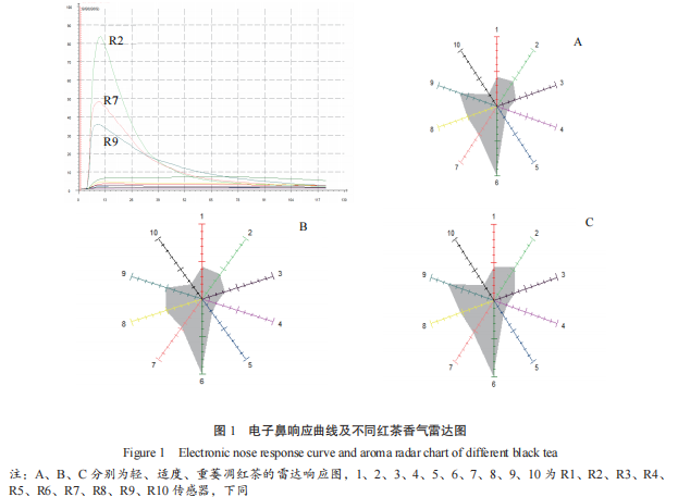 選取適度萎凋的響應(yīng)曲線,即從圖中可以看出初始階段,R2、R7、R9 號傳感器的響應(yīng)值較高,其他的較為平緩,并且 R2、R7、R9 號響應(yīng)值也隨時間的延長,出現(xiàn)平緩的趨勢。由電子鼻響應(yīng)曲線圖中可以看出在 T=118 s 開始各傳感器響應(yīng)曲線逐漸趨于平穩(wěn),因此選取 T=120 s 時的穩(wěn)態(tài)響應(yīng)值作為分析點建立雷達(dá)圖,根據(jù)各傳感器對不同類物質(zhì)的敏感程度,其響應(yīng)值越高表明該類物質(zhì)濃度越高。由圖 1 可知,在三種萎凋方式的紅茶香氣雷達(dá)響應(yīng)圖中,對紅茶香氣敏感的傳感器有 R6、R9、R8、R7、R1和 R2,表明該三組紅茶香氣中烷類、醇類、芳香成分和有機硫化物、氨氧化合物含量較高。