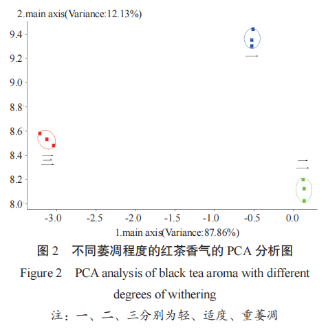 對不同萎凋程度的紅茶進(jìn)行 PCA 分析(圖 2),得出第一主成分的貢獻(xiàn)率 87.860%,第二主成分貢獻(xiàn)率為 12.134%,總貢獻(xiàn)率為99.994%。主成分分析(PCA)就是對多指標(biāo)的高維數(shù)據(jù)進(jìn)行降維,提取數(shù)據(jù)中反應(yīng)最大的幾個特征值對應(yīng)的特征向量作為主成份,貢獻(xiàn)率越大, 說明該主成分在數(shù)據(jù)信息中越重要,越能最大限度地反映樣本最原始的信息。由圖 2 可知,不同萎凋程度的紅茶香氣成分在類別和含量上有了較大的變化,其中重萎凋在第一、第二主成分上明顯區(qū)別于輕萎凋和適度萎凋,表明重萎凋的工藝使紅茶香氣成分在類別和含量上發(fā)生了較為明顯的變化;輕萎凋和適度萎凋在第一主成分上差異不明顯。整體來說,萎凋程度不同,使紅茶香氣的成分表現(xiàn)出明顯的差異??芍獏^(qū)分度值越趨近于 1,表明兩種物質(zhì)差異越明顯。表4中區(qū)分值都在99%以上,表明 PCA 可以將不同萎凋程度的紅茶區(qū)分開。