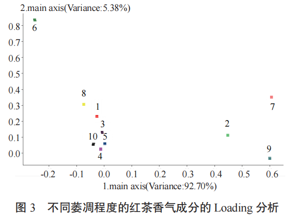 Loadings 分析,反映的是不同傳感器在紅茶香氣的區(qū)分中其貢獻(xiàn)的大小,一般通過傳感器在圖中的位置來判斷其貢獻(xiàn)的大小。傳感器與原點的距離越近,說明傳感器對樣品分析起到的作用越小,反之則表示作用越大。由圖 3 可得第一主成分起主要作用,這和 PCA 分析所得結(jié)論相同,R7 和 R9 傳感器對第一主成分貢獻(xiàn)率最大,R2 次之;R6 傳感器對第二主成分貢獻(xiàn)率最大,R8 次之。R4、R5、R10 傳感器負(fù)載較低,表明其對茶葉香氣成分敏感度較低。Loadings 分析表明在不同萎凋程度的紅茶區(qū)分中硫化物、芳香型化合物、氮氧化合物以及烷類、醇類化合物對區(qū)分貢獻(xiàn)有主要作用。