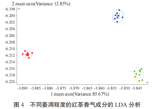 LDA 更側(cè)重于同一類別的空間分布狀態(tài)和距離的精度。LDA 分析是在 PCA 分析后對傳感器響應(yīng)紅茶香氣成分的優(yōu)化,通過擴大差異更直觀的表現(xiàn)不同提香工藝紅茶香氣之間的區(qū)別。圖 4 中第一主成分貢獻(xiàn)率為 85.67%,第二主成分貢獻(xiàn)率為 12.85%,總貢獻(xiàn)率為98.52%,能很好的反應(yīng)紅茶香氣的信息。由圖4 得知,重萎凋與其他兩組距離較遠(yuǎn),可以在線性判別分析完全區(qū)分開;而在第一主成分的貢獻(xiàn)率中,輕萎凋和適度萎凋相差不大,這與 PCA 分析以及感官審評結(jié)果一致,表明這兩種萎凋程度對茶葉香氣的改變差異較小。整體結(jié)果對比 PCA 分析較為相似,說明電子鼻在區(qū)分不同萎凋程度的紅茶香氣中具有可行性。