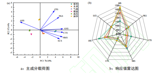 為比較不同烹飪方式對(duì)芫根整體滋味的影響,對(duì)樣品進(jìn)行電子舌分析,結(jié)果如圖3所示。電子舌主成分分析中,第一主成分(PC1)和第二主成分(PC2)的貢獻(xiàn)率分別為74.54%和17.44%,總貢獻(xiàn)率達(dá)91.98%,已超過(guò)85%,說(shuō)明這兩個(gè)主成分涵蓋了絕大多數(shù)樣品信息,可以用來(lái)表征芫根的滋味特征。主成分載荷圖中,以散點(diǎn)代表各個(gè)樣品,距離越近,表明樣本滋味相似度越高,對(duì)主成分貢獻(xiàn)大的影響因子以射線形式表示出來(lái),影響因子越靠近樣品表明對(duì)相應(yīng)樣品影響越大。6種芫根樣品分散區(qū)域明顯,表明電子舌能夠較好的區(qū)分不同烹飪方式的芫根。新鮮芫根與其他5種芫根樣品距離較遠(yuǎn),ANS和CTS傳感器對(duì)其影響較大,其中CTS傳感器對(duì)咸味具有特敏性,結(jié)合圖3b可知,新鮮芫根在ANS和鮮味特敏傳感器NMS上響應(yīng)值較高,在咸味CTS和酸味AHS傳感器上響應(yīng)值次之,烹飪后,鮮味NMS傳感器響應(yīng)值減弱,咸味CTS響應(yīng)值也明顯降低,酸味AHS響應(yīng)值增強(qiáng),說(shuō)明烹飪處理會(huì)減弱芫根本身的咸鮮味,突出酸味。油炒的芫根整體響應(yīng)值較大,與其他樣品距離較遠(yuǎn),說(shuō)明油炒的與其他烹飪處理的芫根整體滋味差異較大,一方面是因?yàn)橛统礈囟容^高導(dǎo)致,另一方面食用油也會(huì)對(duì)芫根滋味產(chǎn)生影響。水煮和氣蒸的芫根在主成分圖中距離較近,說(shuō)明這兩種方式烹飪的芫根整體滋味相似;同理可得微波和高壓烹飪的芫根滋味相似。