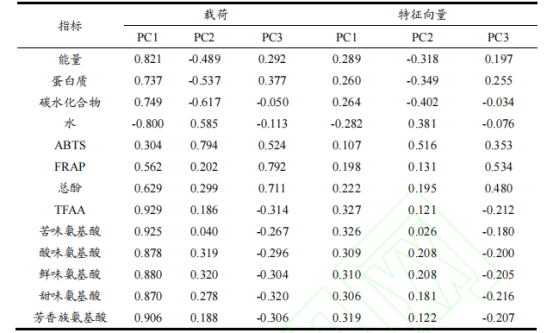 取100g樣品,利用食品熱量成分檢測(cè)儀測(cè)定樣品中的能量、蛋白質(zhì)、脂肪、碳水化合物和水分含量。 總酚含量以沒食子酸為參照物,采用Folin-Ciocalteus法測(cè)定;抗氧化能力采用鐵離子抗氧化能力法測(cè)定,均以維生素E(Trolox,TE)為標(biāo)準(zhǔn)對(duì)照。 取30g樣品,加270mL蒸餾水,利用破壁機(jī)制成勻漿,過(guò)濾,取100mL濾液上機(jī)。電子舌分析條件:采集120s,清洗180s。